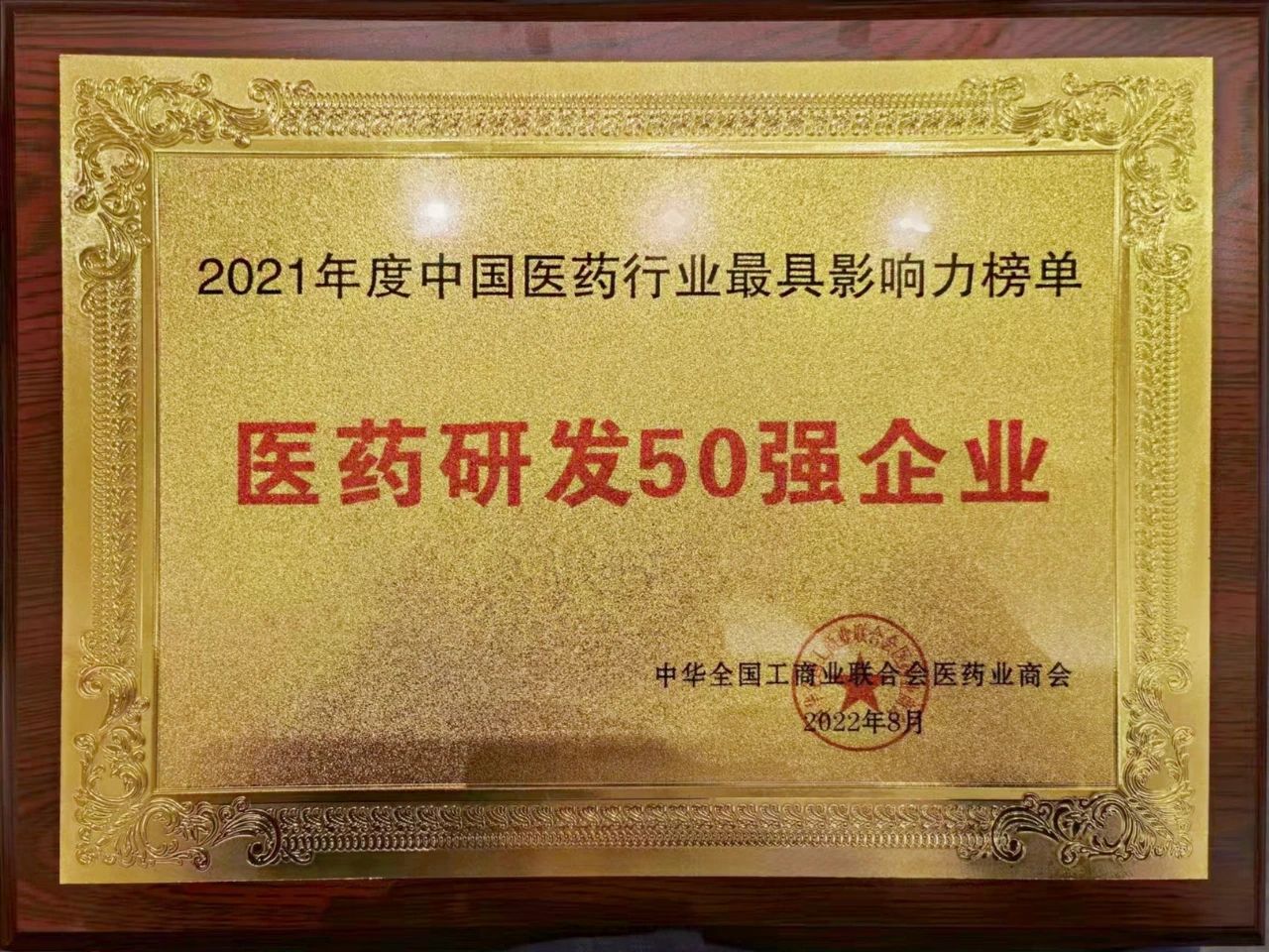 北京盈科瑞創(chuàng)新醫(yī)藥股份有限公司獲得2021年度中國醫(yī)藥行業(yè)最具影響力榜單評選中獲"醫(yī)藥研發(fā)50強企業(yè)"榮譽