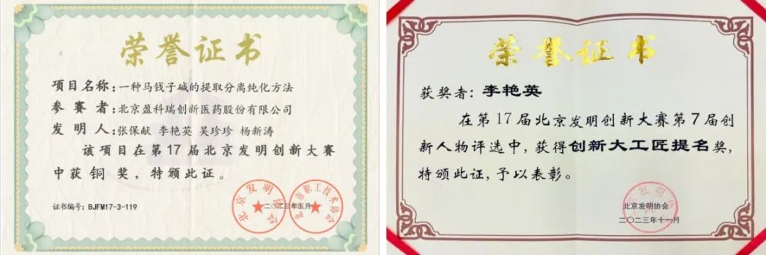 (3)2023年6月,在北京市發(fā)明協(xié)會(huì)組織的“第17屆北京發(fā)明創(chuàng)新大賽創(chuàng)新人物暨第7屆創(chuàng)新大工匠評(píng)選活動(dòng)”,盈科瑞憑借“一種馬錢子堿的提取分離純化方法”獲得發(fā)明創(chuàng)新獎(jiǎng)銅獎(jiǎng),盈科瑞科研總裁李艷英獲得第7屆“創(chuàng)新大工匠”提名獎(jiǎng)。